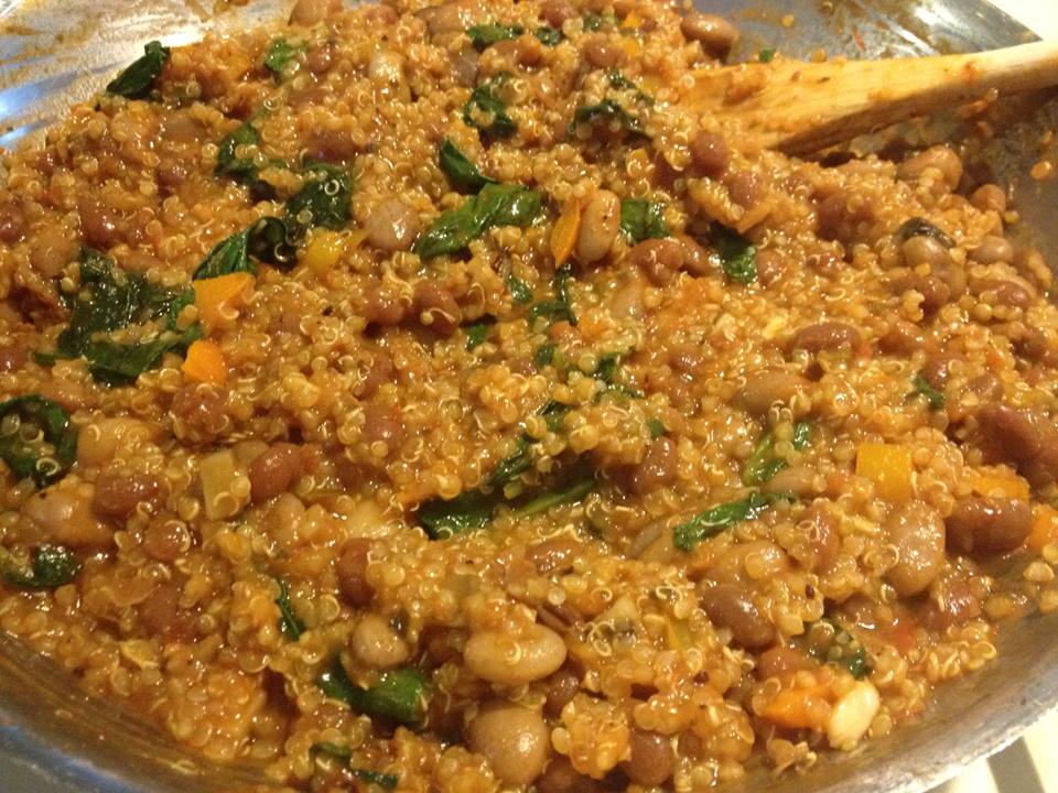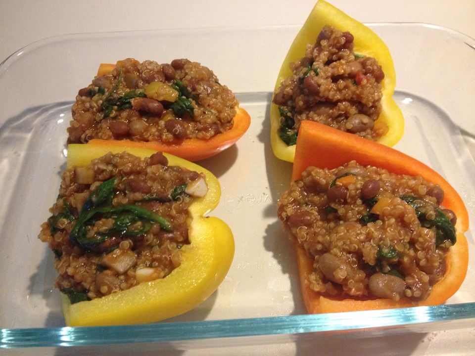 Heat the olive oil in a saute pan over medium heat, add garlic, and cook for 1-2 minutes until soft and fragrant. Add the chopped pepper from around the stems, mushrooms, beans Worcestershire sauce and tomato sauce. Cook for five minutes until heated through and mixture begins to bubble. Add spinach and quinoa stir to combine. once the spinach is wilted, Remove mixture from heat.