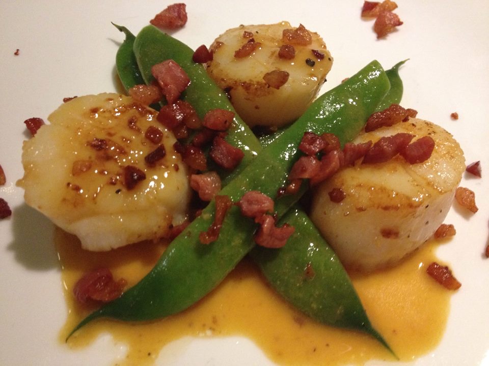 Place 3 scallops on each serving plate, forming a triangle in center of plate. Arrange 4 beans inside the scallop triangle. Drizzle with sauce, and sprinkle with reserved pancetta, and Parmesan.