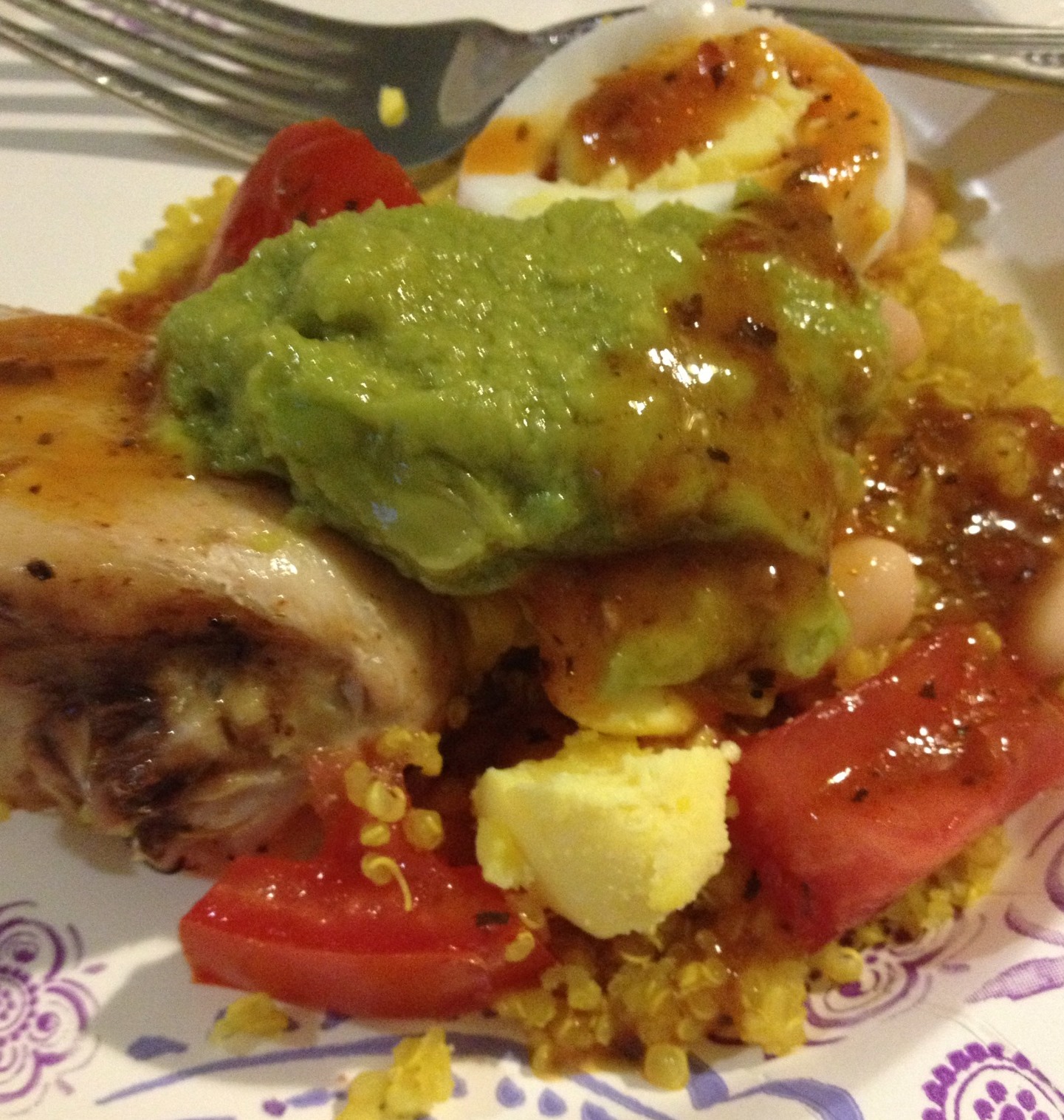 About a month ago, I saw something about different types of lunch bowls and I was intrigued. Last week I decided to prepare some. I wanted to make enough so that the family could enjoy more than one meal, and make eating healthy an easy choice. It was a fabulous idea! I had 4 1/2 pound of organic chicken drumsticks in the freezer, and I baked them all. After cooked, some could be frozen if you don’t use them up in time. I also made up a large batch of turmeric and ginger spiced quinoa as the base of these bowls. I’m so glad I did this because not only did I have dinner for one night, we had a busy night of swim lessons a few nights later and had no plan for dinner, so protein bowls to the rescue! We added steak that night! I also had enough to have healthy lunches all week!The great thing about these is you can get lots of versatility out of them by adding many different topping and dressing options to choose from. The kids enjoyed this very much, as they were in charge of what went in their protein bowl.