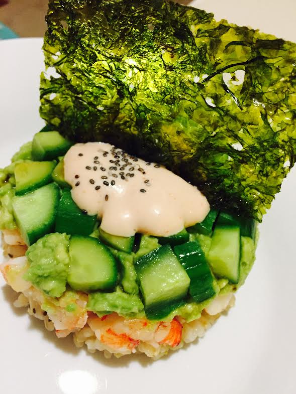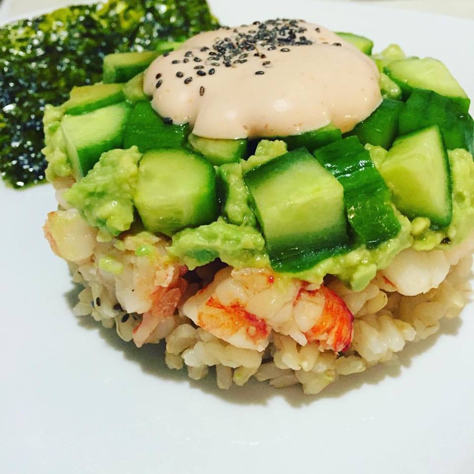Use a one cup measuring cup and layer in this order: cucumber, avocado, shrimp, then rice. Flip over onto plate and drizzle with more aminos, yum yum sauce, and a sprinkling of black chia or sesame seeds. Serve with sea weed if desired. Makes 5-6 stacks with extra sauce.