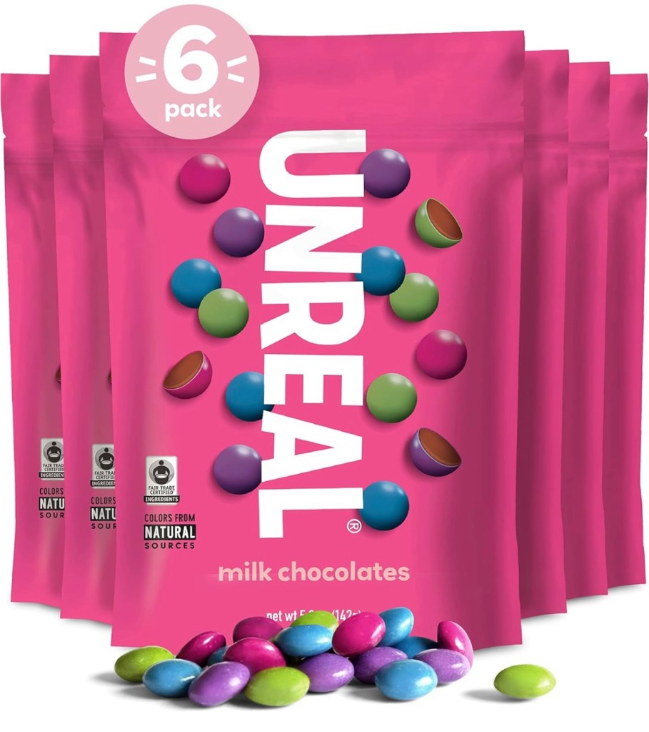 “UNREAL is on a mission to build a world where you don’t have to be afraid of your food, starting with your favorite indulgent snacks.ALL-NATURAL: our milk chocolates are made with RBST-free dairy, do not contain soy ingredients and are made in small batches with fair trade certified ingredients. COLORED BY NATURE: we only use colors from all-natural veggies such as spirulina and beets, and we never use titanium dioxide as a processing agent, as many similar products do.”