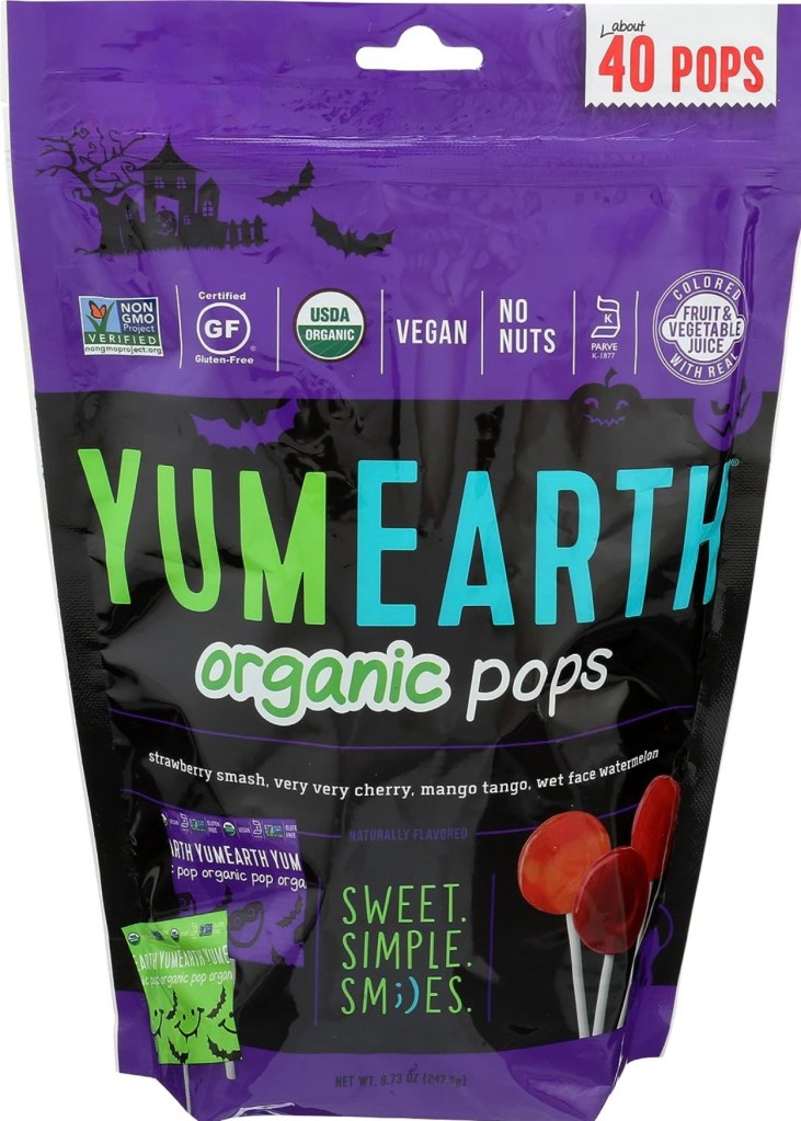 “Organic Gummy Fruits are perfect for all trick or treaters and are even better for those wtith allergies since they are Nut Free, Gluten Free, Dairy Free, Soy Free and more. These bat and fang shaped candies come in assorted flavor packs that may include Strawberry Smash, Perfectly Peach and Very Very Cherry.”
