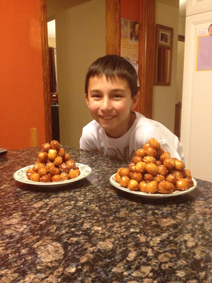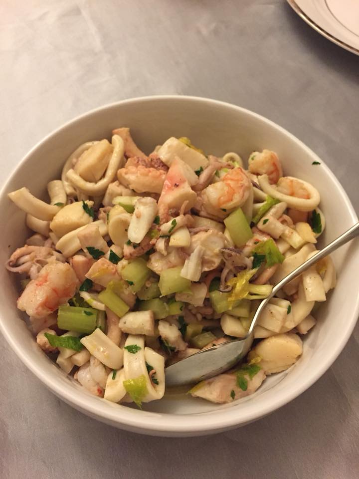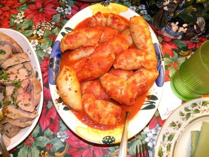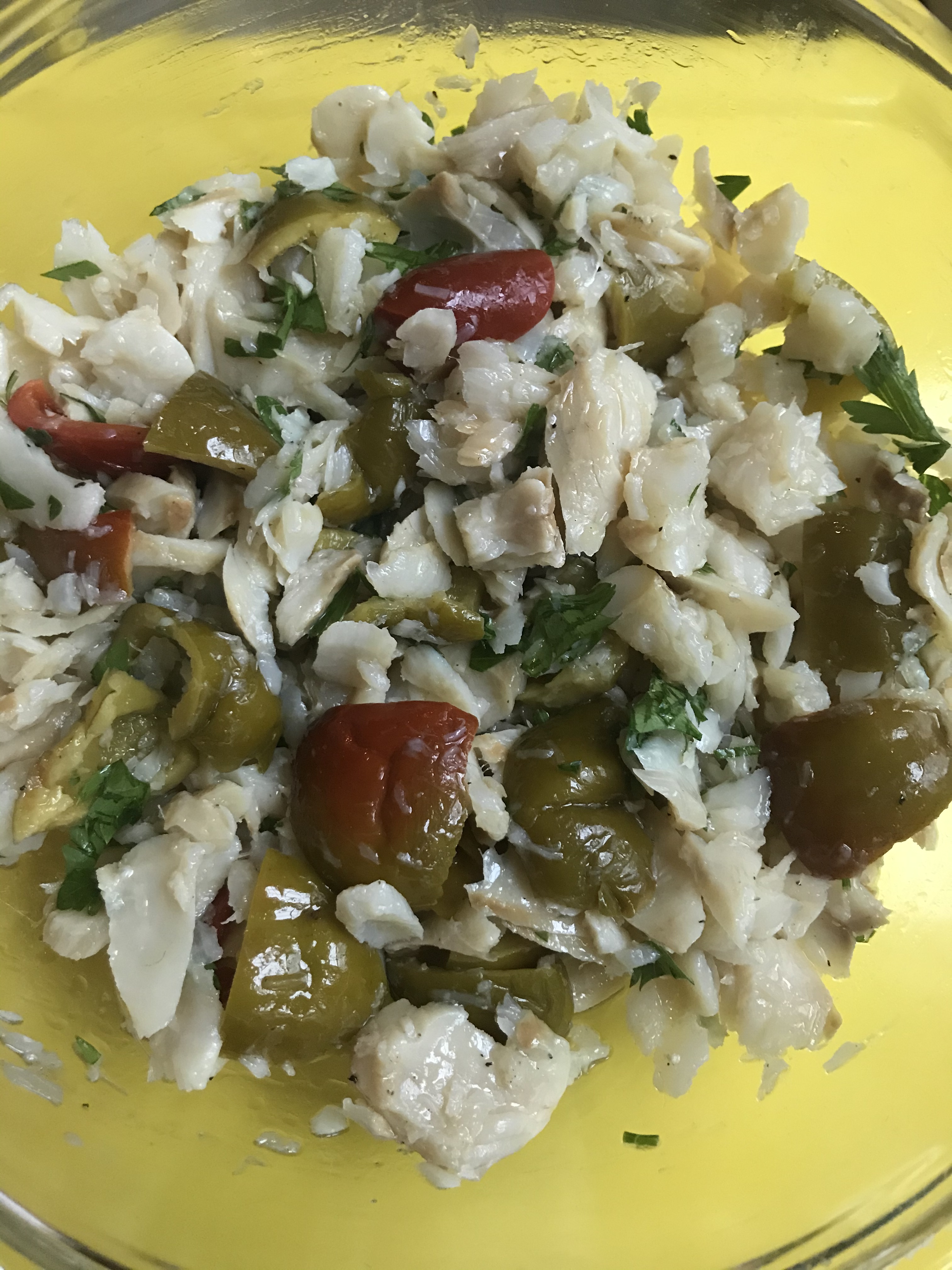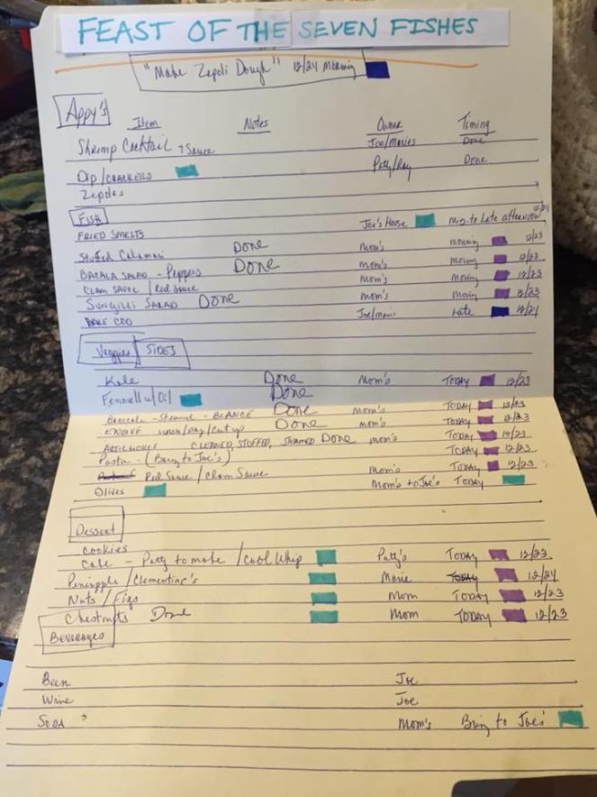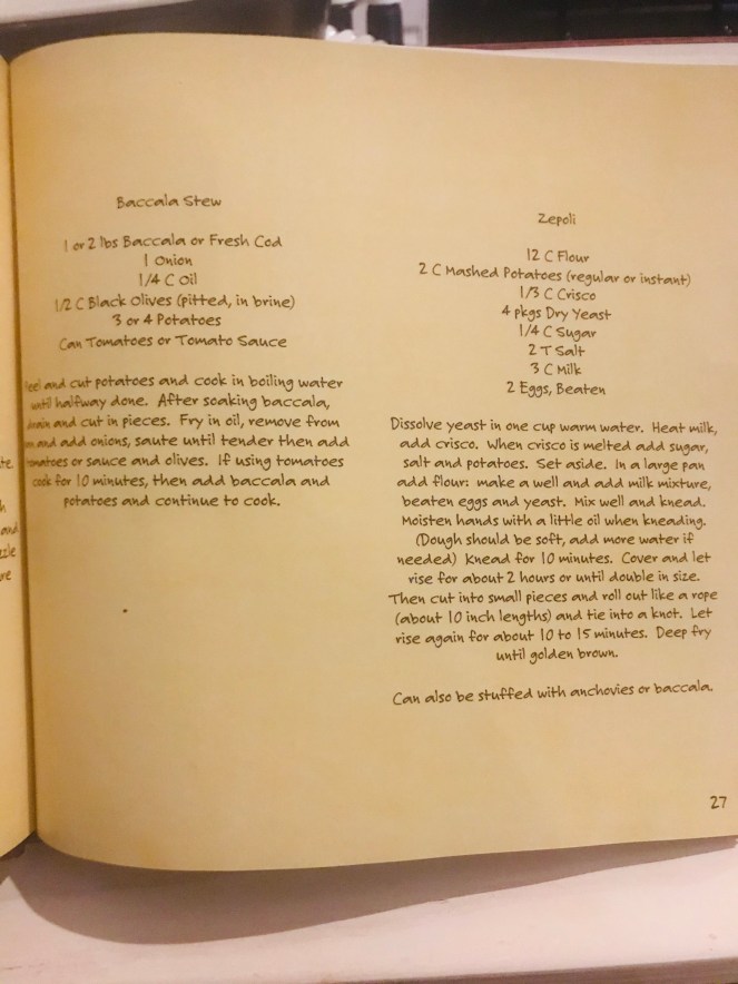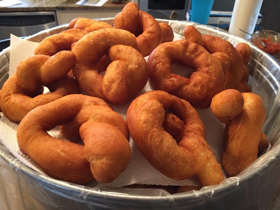 Our feast starts with zeppoli being made around 10:00 am. Zeppoli is an Italian fried dough. We serve it plain and knotted, or filled with either anchovy or baccala (salted cod). This tradition is so much fun and everyone loves fresh, hot zeppoli!