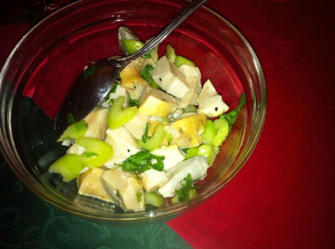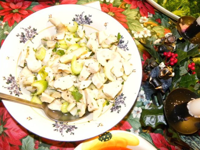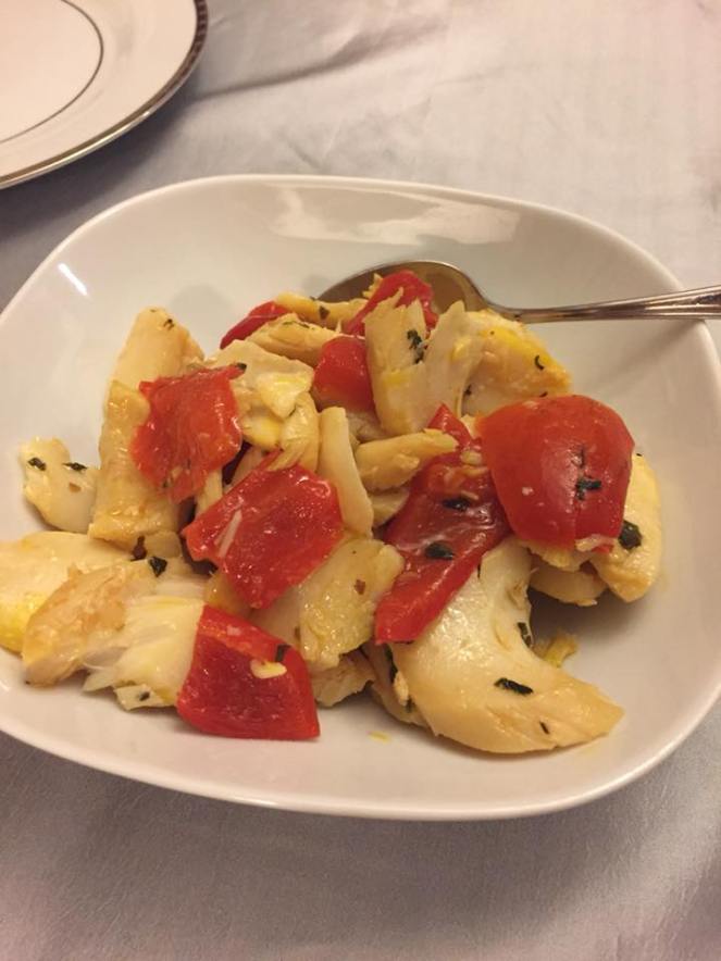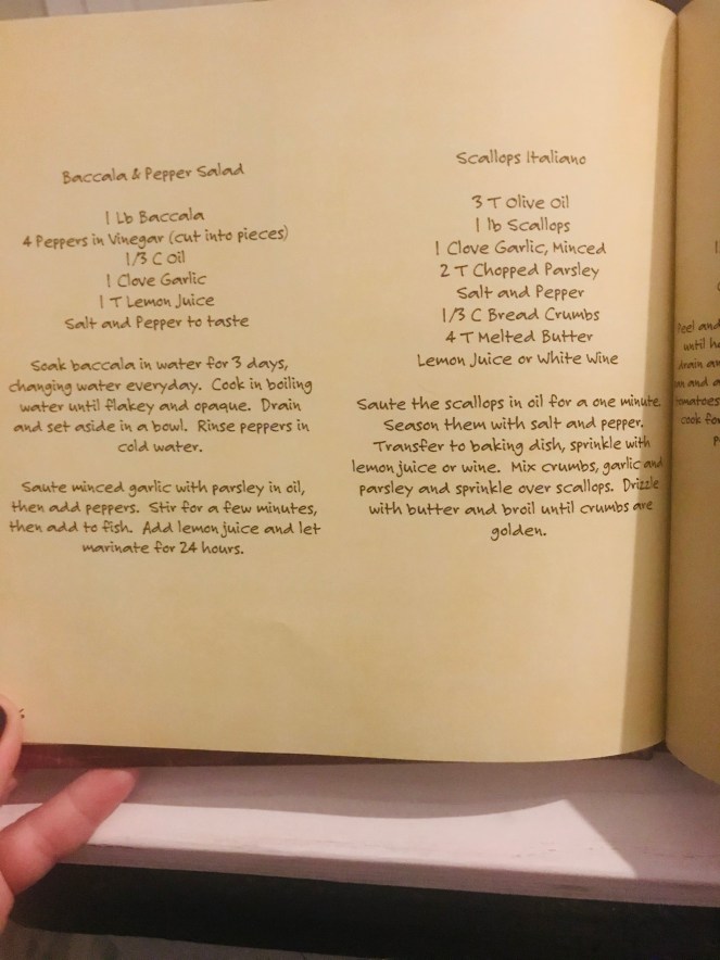 Other staples are a mixed fry of smelts, shrimp, and calamari. Scallops are baked simply with garlic, lemon, parsley, and breadcrumbs. Two cold fish salads of baccala (salted cod) with vinegar cherry peppers, and scungilli (conch) salad with celery, parsley and lemon juice. Baccala is also made into a stew with marinara sauce, black olives, and potatoes. Vegetables include stuffed artichokes, frissee’ or escarole salad, kale or broccoli rabe speziati with garlic, olive oil and hot pepper flakes. Occasionally, a cold orange segment and carrot salad is served.