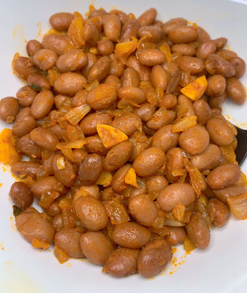 Sauté onions and garlic over medium heat until translucent. Add beans and spices and cook over low heat, stirring occasionally. These can be done when heated through, but the longer they cook, the flavors develop. 20-30 minutes is good.