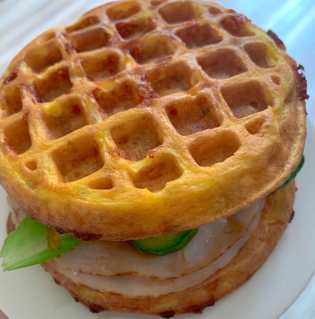 Can we talk Chaffles for a moment? How easy and quick these are to make, and how yummy? A Chaffle is essentially a Cheese Waffle. A mixture of egg, shredded cheese, spices, baking powder. You can use them as a bread substitute as I did here with a sandwich. I have turkey, cucumber, Tower Garden Lettuce, and Hot Honey Drizzle. I would love to try to make these with vegan cheese, and a chia egg and see how they come out. I used pasture-raised eggs here. Have you ever tried a Chaffles?