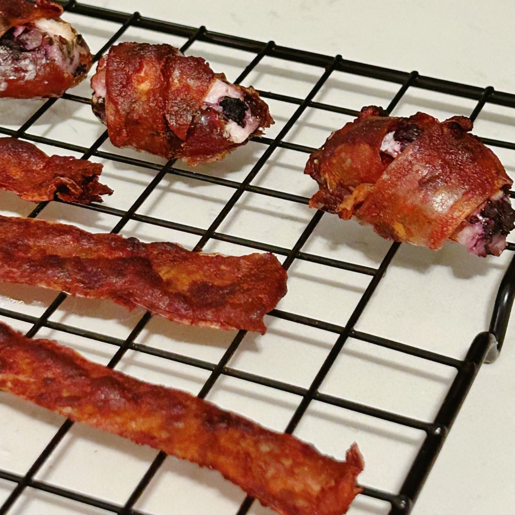 Cut a slit in your dates to stuff about a tsp of cheese inside. Wrap with vegan bacon. Airfry or bake for 5-10 minutes until crisp.